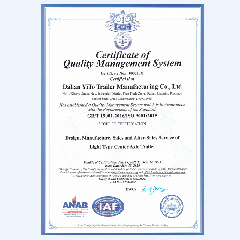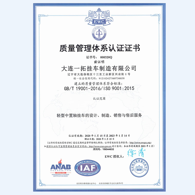 大連一拓掛車制造有限公司,地處遼寧省大連保稅區(qū)十三里工業(yè)新區(qū)興業(yè)街1號,公司占地45000m㎡,總建筑面積24000㎡,現(xiàn)有生產(chǎn)、檢測、研發(fā)設(shè)備100余臺套,擁有自動化程度很高的機器人焊接生產(chǎn)線。大連一拓掛車制造有限公司成立于2013年,是一家具備國家工信部專用車生產(chǎn)資質(zhì)企業(yè),致力于乘用車掛車的設(shè)計和生產(chǎn),主要產(chǎn)品有:平板板式輕型中置軸掛車、欄板式輕型中置軸掛車、廂式輕型中置軸掛車、特種結(jié)構(gòu)式輕型中置軸掛車,并承接各種用途輕型中置軸掛車設(shè)計等業(yè)務(wù)。公司秉承“銳意進取,開拓創(chuàng)新,精益求精,誠信共贏”的運營理念,竭誠為您服務(wù)。